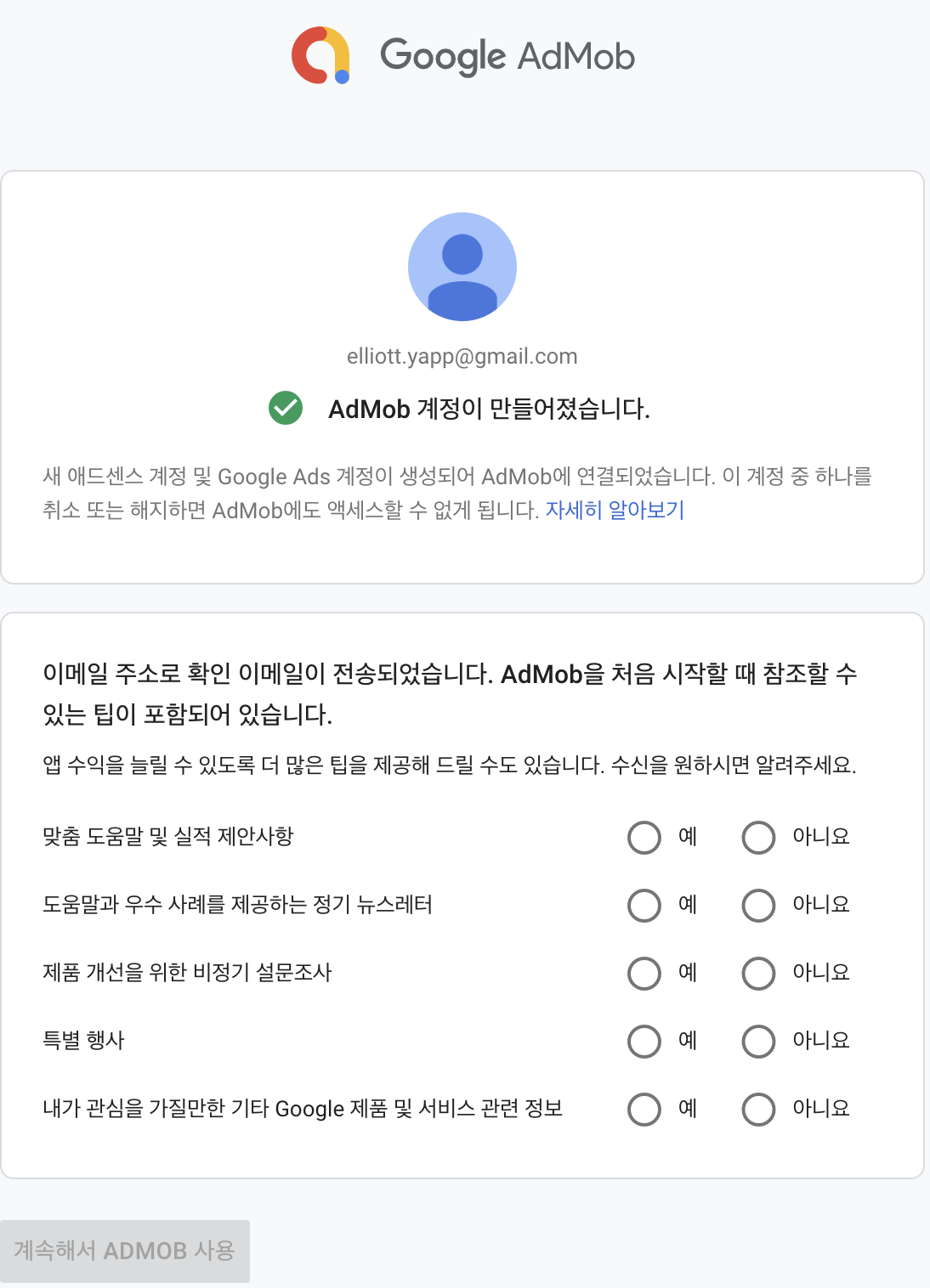 그 다음 이메일 수신에 대한 동의 여부를 선택하는 화면이 나오게 되는데 원하는 항목에 대하여 예/아니요를 선택한 후 계속해서 ADMOB 사용 버튼을 눌러줍니다.