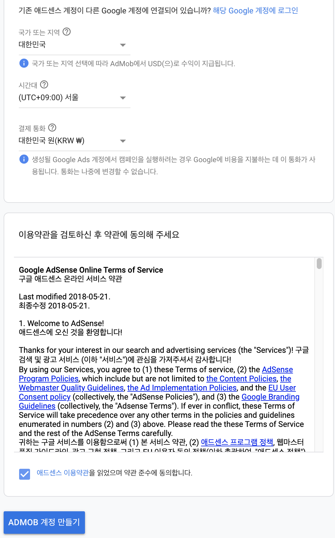 적절한 정보를 입력한 후 약간 동의에 체크표시를 한 후에 ADMOB계정 만들기 버튼을 눌러 가입을 완료하세요.