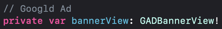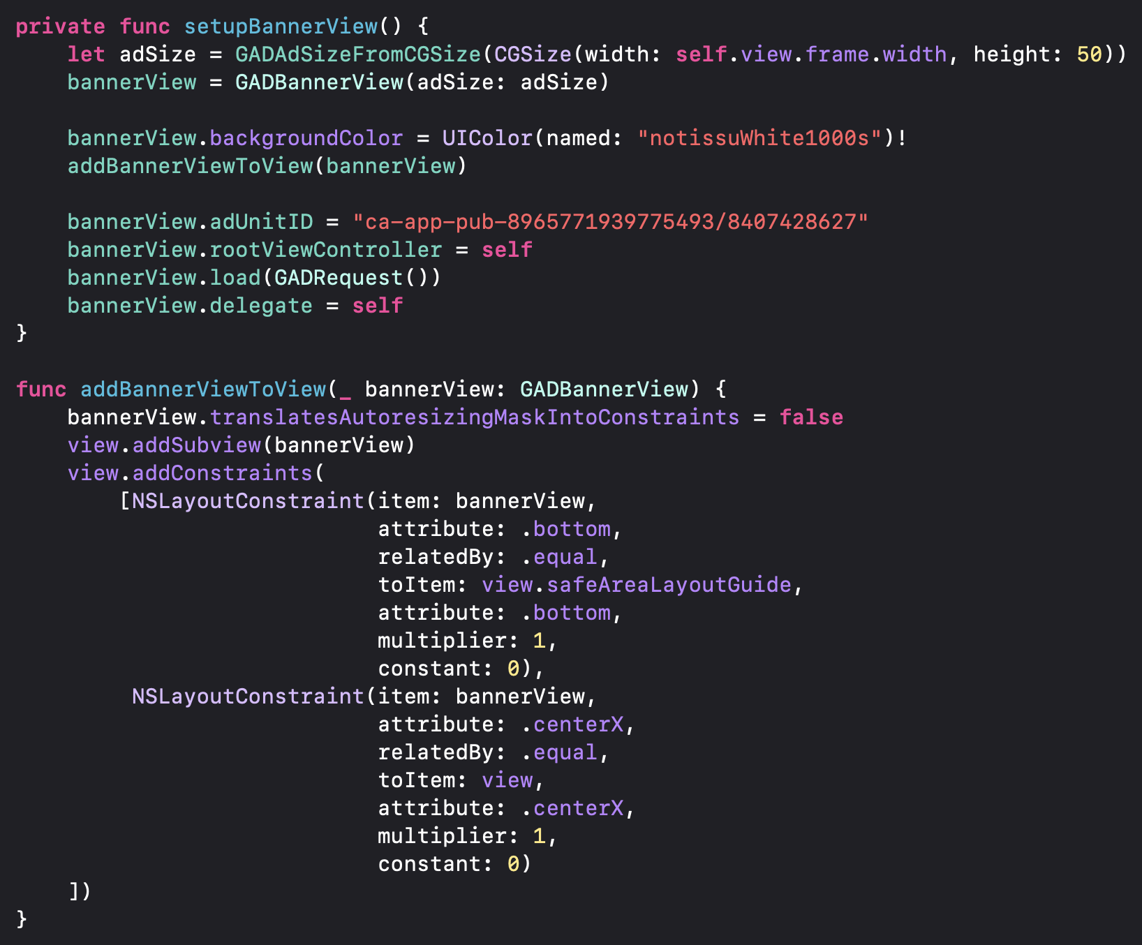 그 다음 bannerView를 초기화해주고 superview에 추가해주는 함수를 생성해줍니다.