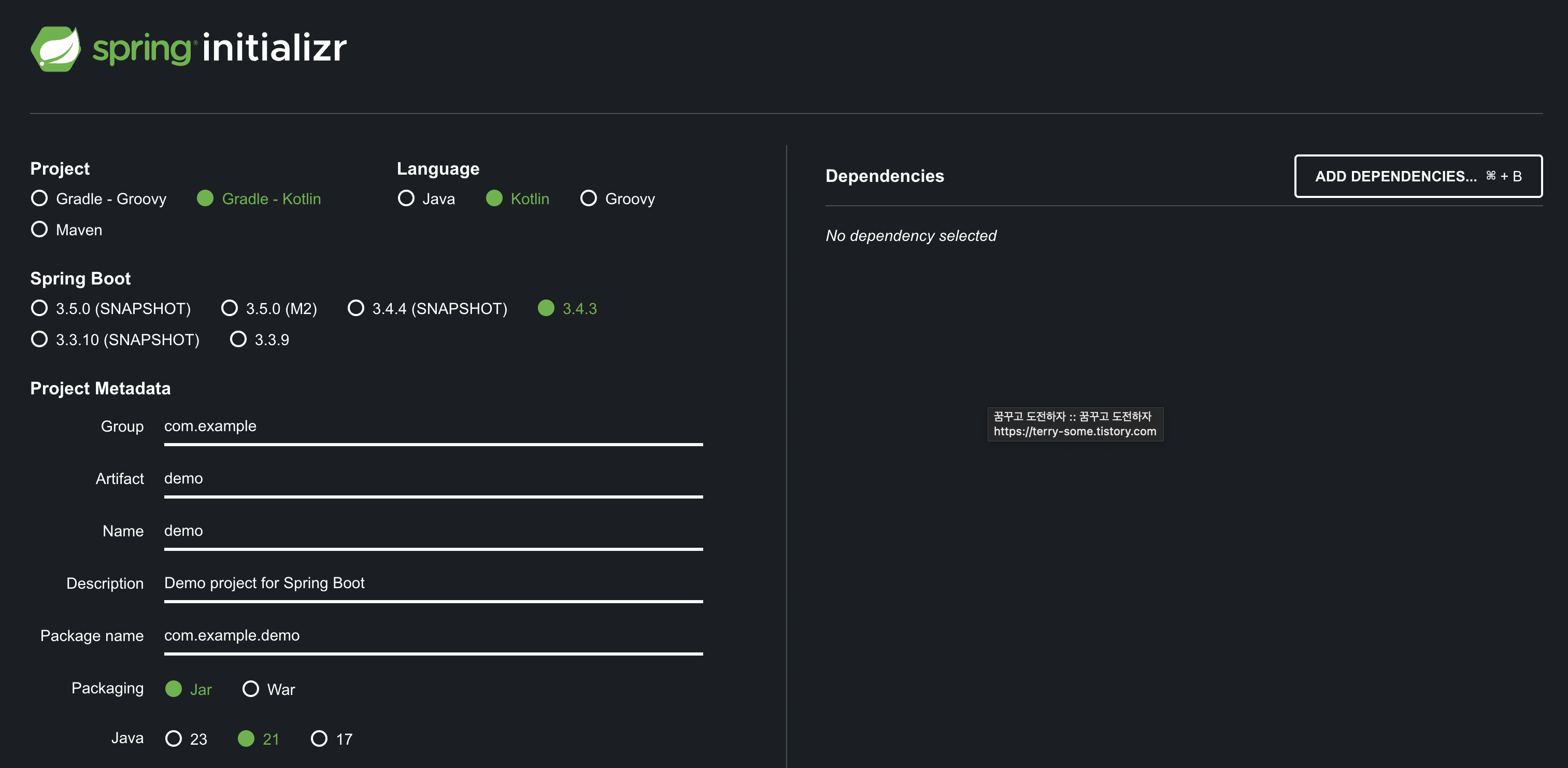 - Spring Initializr를 사용하여 Kotlin 기반의 Spring Boot 프로젝트 생성
