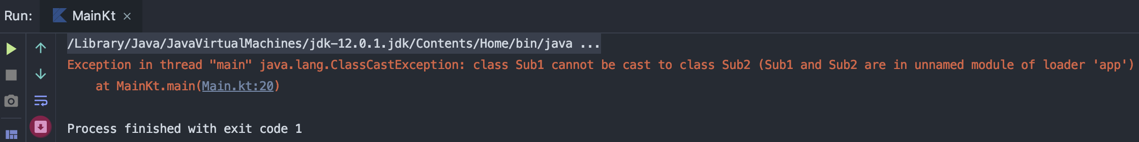 val obj8: Sub1 = obj7 as Sub1 // RUNTIME ERROR