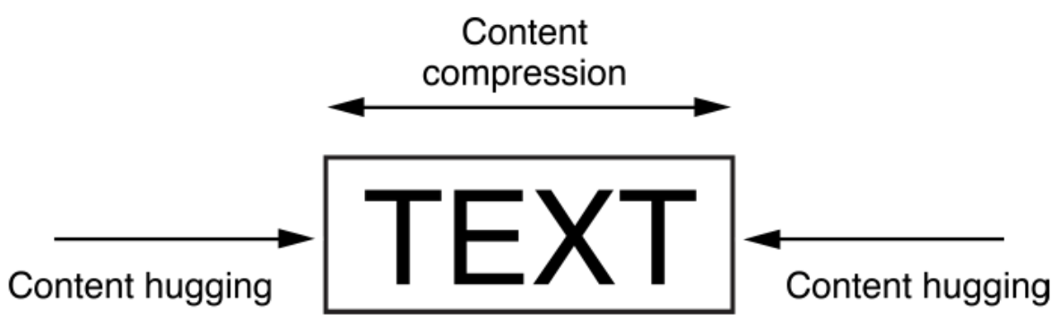 각 뷰에는 위와 같이 제약이 걸려 있는데요. 내부의 크기의 최소 크기에 대한 제약이 content compression이고 외부에 대한 최대 크기에 대한 제약이 content hugging입니다.