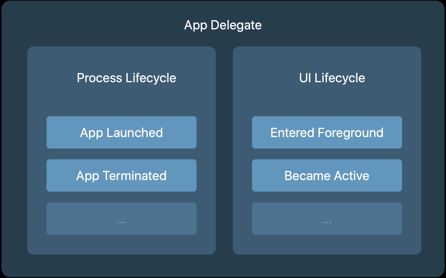 위 그림을 보면 iOS 12까지는 App Delegate에 Process Life Cycle과 UI Life Cycle이 있었습니다. Process Life Cycle은 어플리케이션이 실행되었는지 종료되었는지 알 수 있는 부분이고 UI Life Cycle은 현재 Foreground에 나와있는지 비활성화 되어있는지 등의 State를 관리하는 부분입니다. 이렇듯 App Delegate에서 모두 관리를 하는 방식이었습니다.