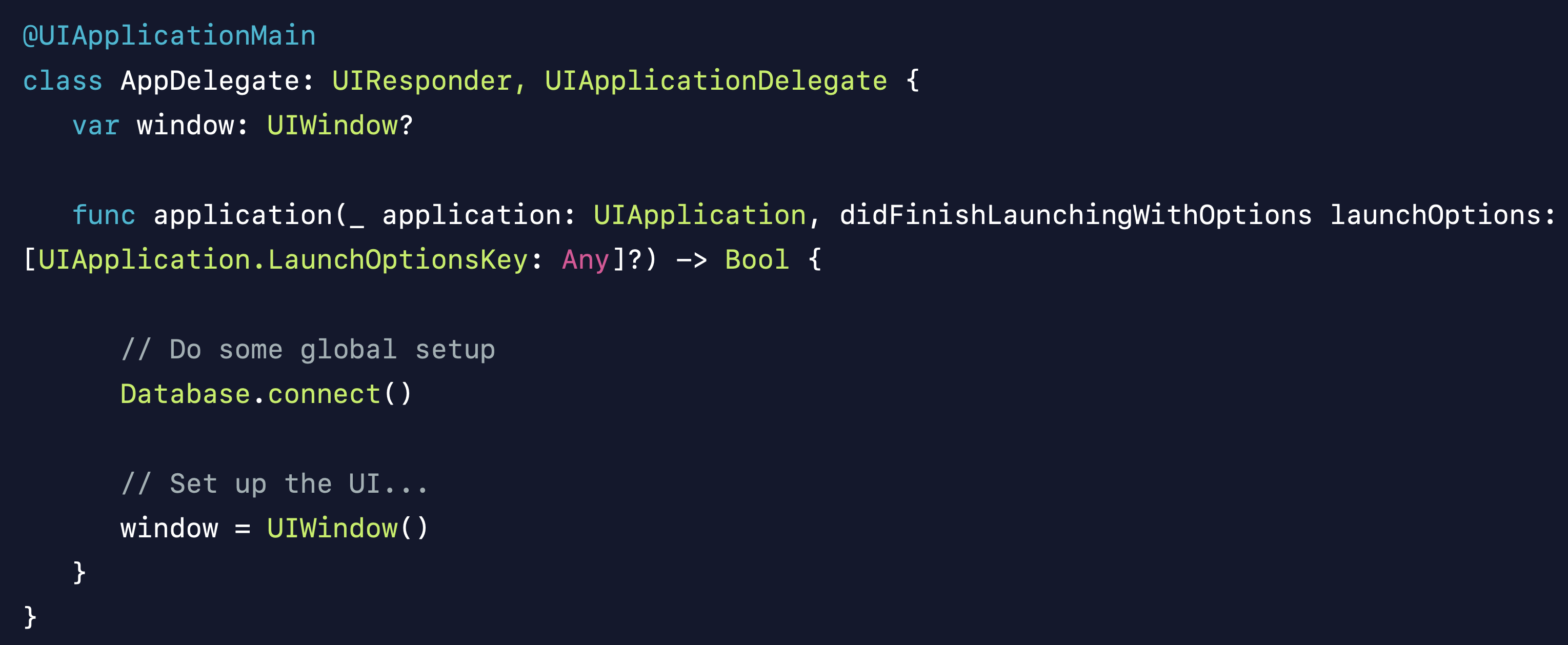 우리가 흔히 사용하던 App Delegate 코드였습니다. 하나의 앱은 1개의 프로세스와 1개의 UI를 가지고 있기 때문입니다.