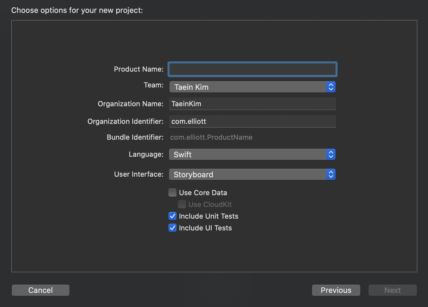 Include Unit Tests, Include UI Tests 중 원하는 항목을 체크하면 테스트코드를 사용할 수 있습니다.