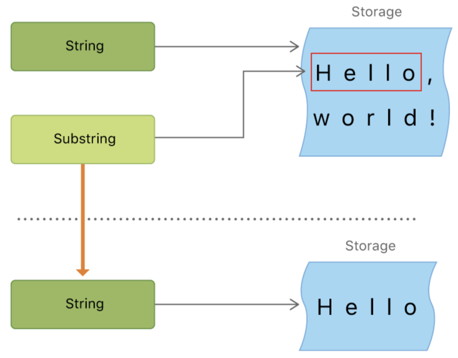 문자열에서 부분문자를 얻기 위해 prefix (_:)와 같은 서브스크립트 메소드를 이용할 수 있는데, 그렇게 얻은 부분 문자열은 문자열(String) 인스턴스가 아니라 부분문자열(SubString) 인스턴스 입니다. 만약 부분 문자열을 단기간에 사용하는게 아니라 오랜기간 사용한다면 문자열 인스턴스로 바꿔서 사용하는게 좋습니다.