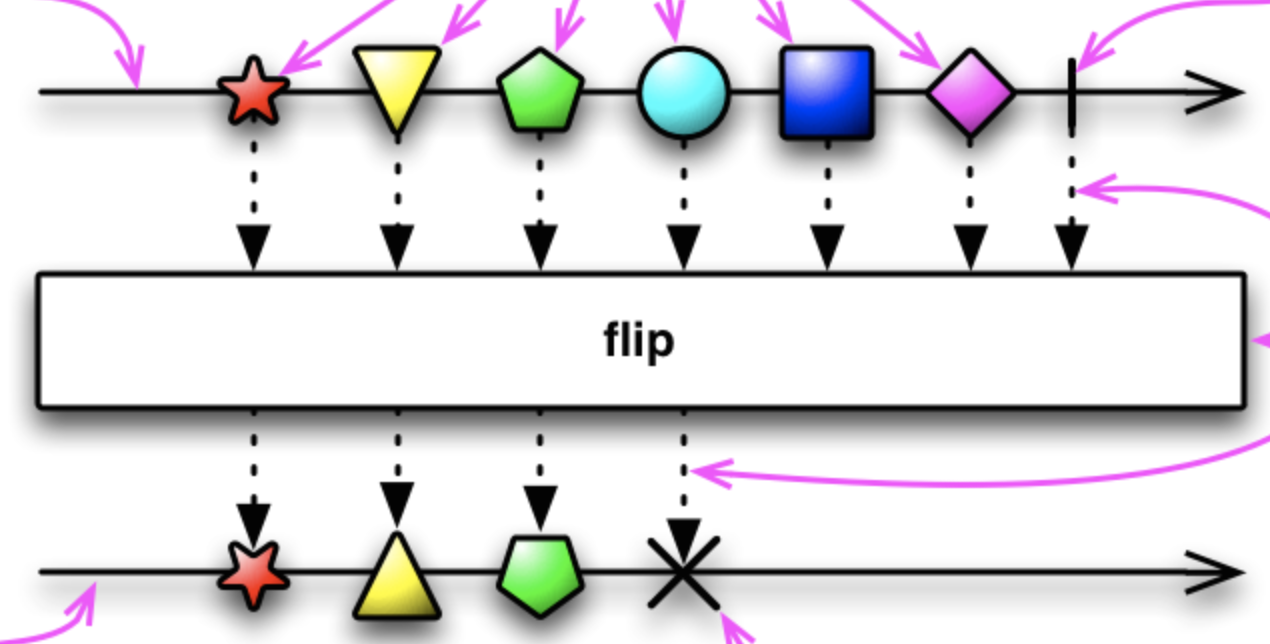 스케쥴러는 프로그램의 세부 일정을 주관하는 관리자라고 생각하면 좋습니다. 그 동안 RxJava를 사용하여 구현해온 코드들은 모두 main Thread에서 동작하는 코드입니다. 그런데 실무에서는 요구 사항에 따라 비동기로 동작할 수 있도록 스레드를 지정할 수 있어야 합니다. (메인 스레드로 고정된 것을 바꾸어야 함) 스케쥴러는 스레드를 지정할 수 있게 해줍니다. 새로운 스레드를 생성하거나 기존의 Executors를 활용하는 것을 넘어서 새로운 방식으로 동작이 이루어 집니다. 스레드를 만들면서 경쟁 조건이나 synchronized 키워드를 사용했다면 스케쥴러는 이와 같은 것들을 신경 쓸 필요가 없어집니다. flip()의 기능 보다는 시간 표시줄에 더 집중해서 살필 필요가 있습니다. 위 마블 다이어그램을 코드..
